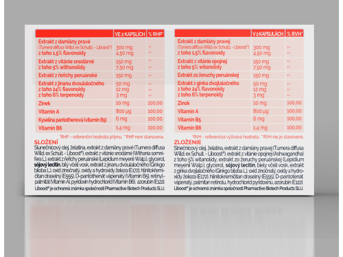 slnečnicový olej, želatína, Extrakt z damiány pravej (Turnera diffusa Willd. ex. Schultz. - Liboost®), extrakt z vitánie opojnej (Withania somnifera L.), extrakt zo žeruchy peruánskej (Lepidium meyenii Walp.), glycerol, sójový lecitín, biely včelí vosk, extrakt z ginka dvojlaločného (Ginkgo biloba L.), oxid zinočnatý, oxidy a hydroxidy železa (E172), hlinitokremičitan draselný (E555), D-pantotenát vápenatý, palmitan retinolu, hydrochlorid pyridoxínu, azorubín (E122).