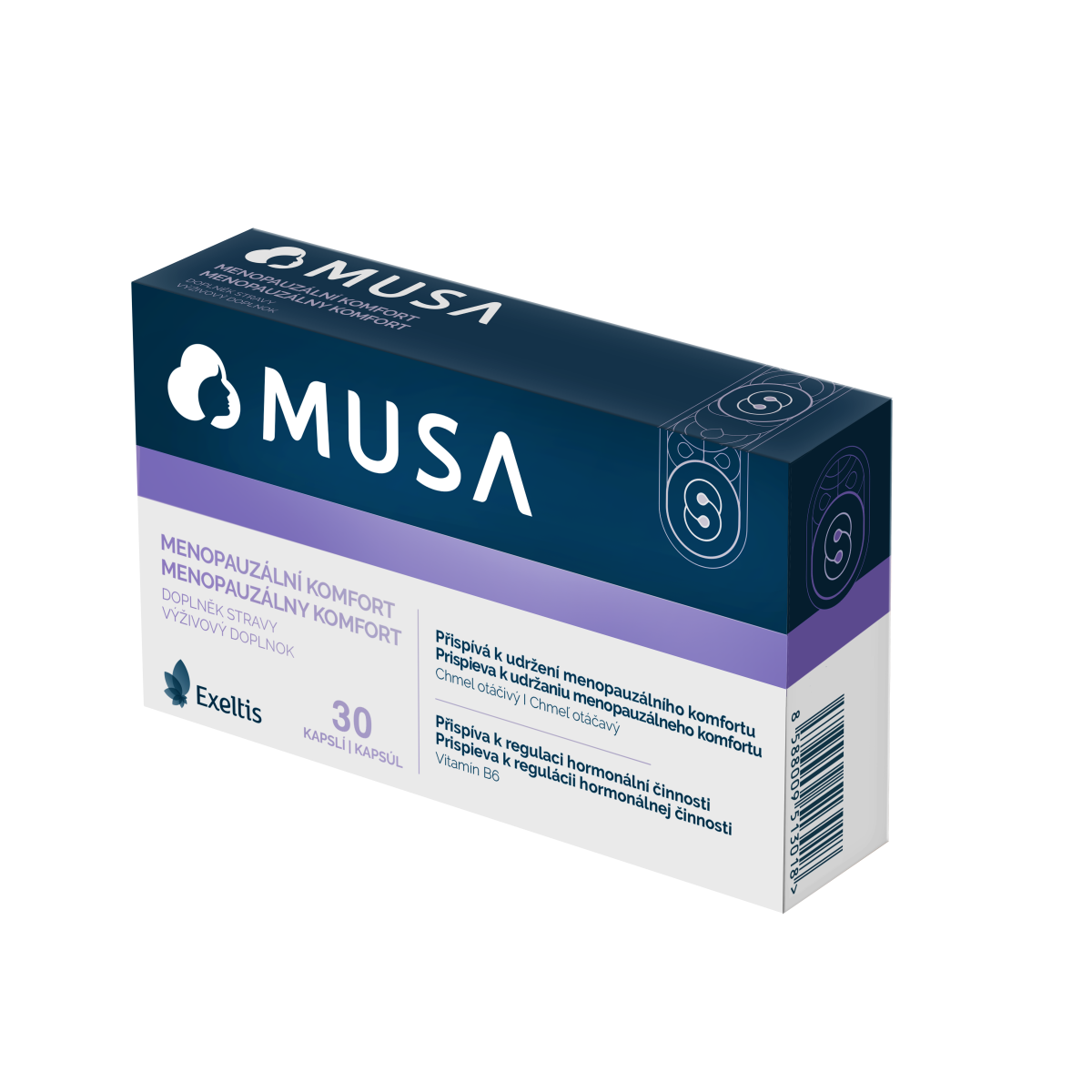 MUSA MENOAPUZÁLNY KOMFORT je výživový doplnok, ktorý prispieva k udržaniu menopauzálneho komfortu (Chmeľ otáčavý) a k regulácii hormonálnej činnosti (Vitamín B6).